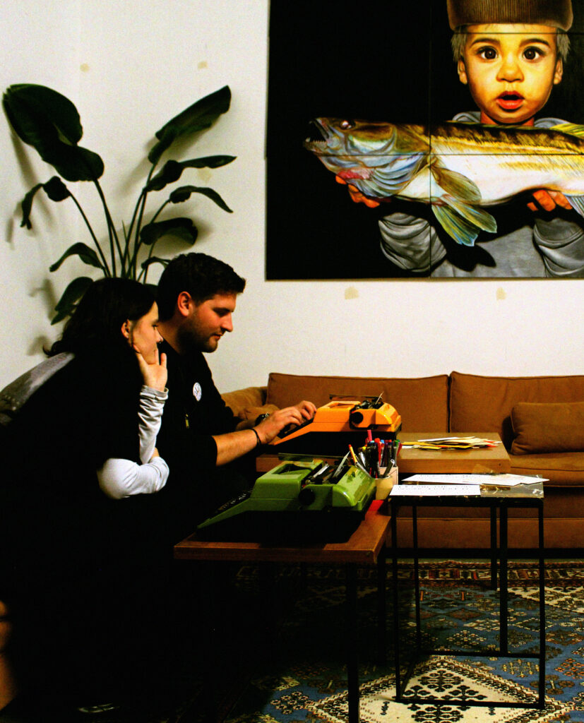 Ausstellungsraum mit Schreibmaschinen – hier Techniker Lucas Hans an einer „Olymp Monica“; im Hintergrund an der Wand ein Bild von Rosa Vogt